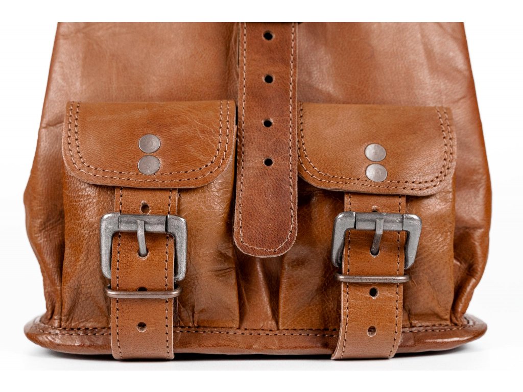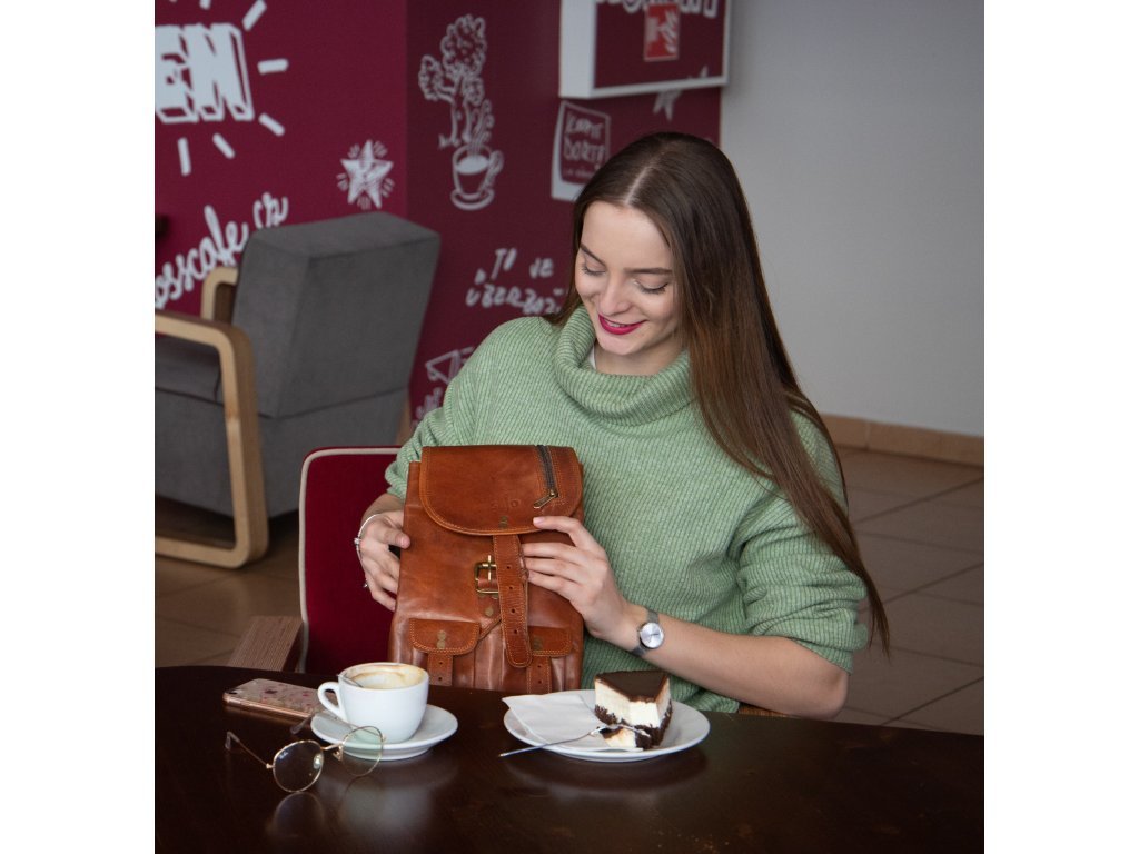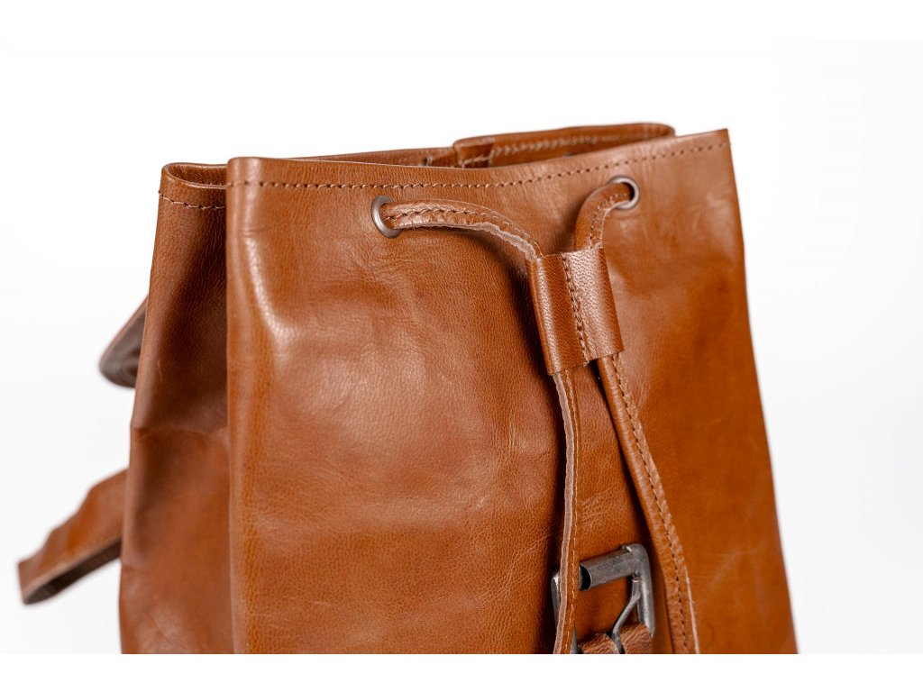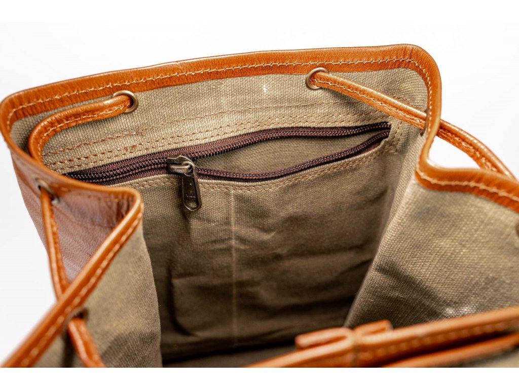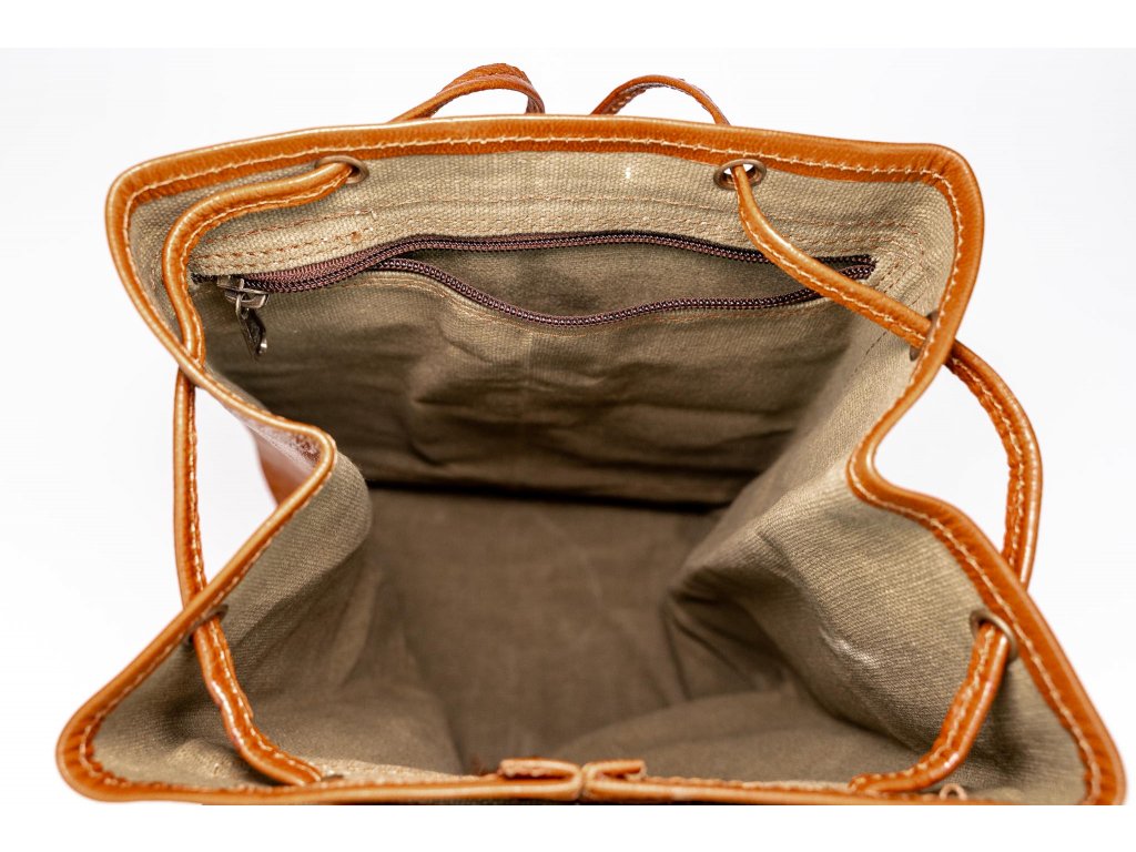 Hlavná časť batohu sa uzatvára pomocou remienka a uťahovacej koženej šnúrky, čo podčiarkuje jeho klasický a autentický štýl. Popruhy je možné ľahko nastaviť pre maximálne pohodlie pri nosení. Vnútorný priestor je podšitý zelenou látkou, ktorá dodáva batohu osobitý charakter.