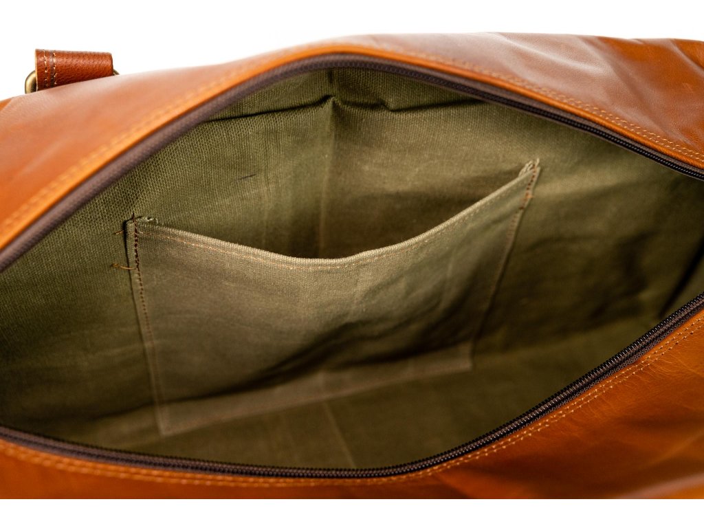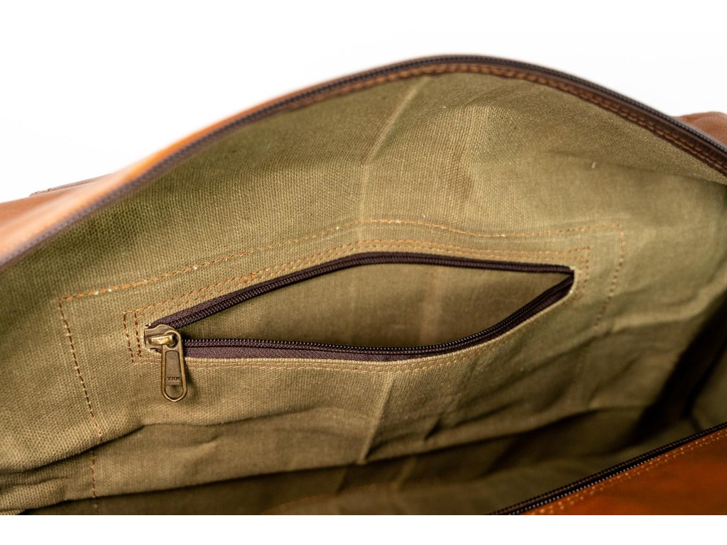 Na prednej strane aj po stranách tašky nájdete ďalšie vrecká uzatvárateľné remienkom, ideálne pre veci, ktoré chcete mať ľahko dostupné. Vnútorný priestor je podšitý zelenou látkou, ktorá nielen chráni obsah, ale dodáva taške jej jedinečný charakter.
