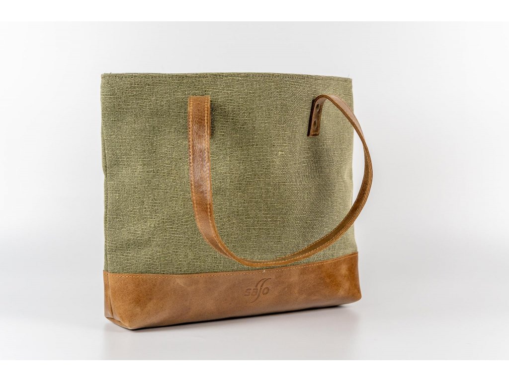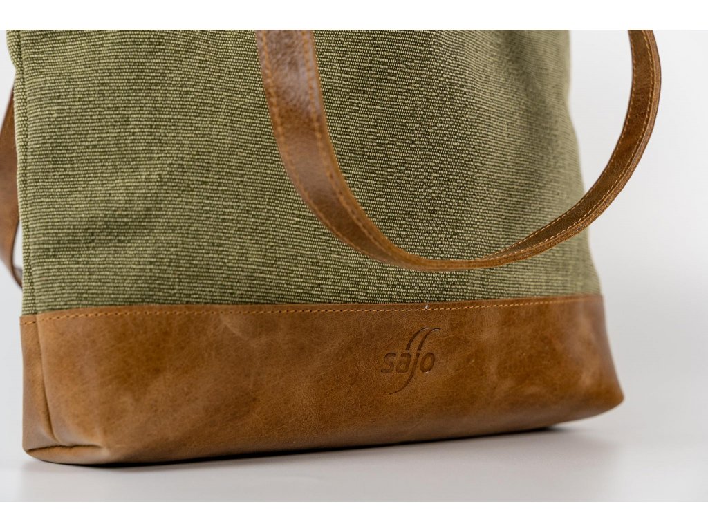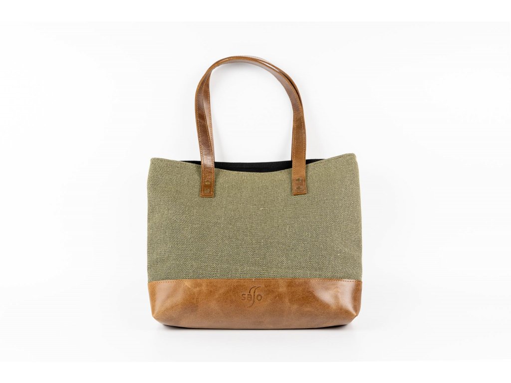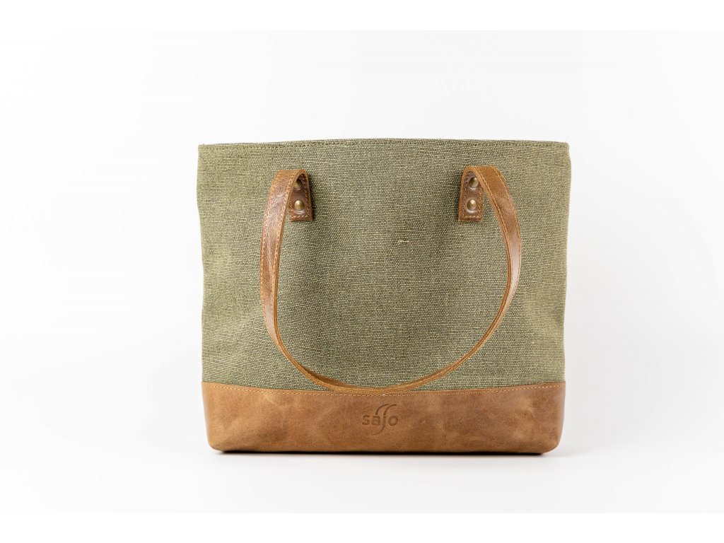 ŠALINI mestská taška je unikátnou kombináciou hovädzej rustikálnej kože a zeleného plátna, ktoré spája prírodnú autenticitu s modernou eleganciou. Jej otvorený dizajn bez zipsu či cvokov zaisťuje ľahký prístup k vašim veciam, zatiaľ čo jej veľkorysý vnútorný priestor poskytuje dostatok miesta pre všetko, čo potrebujete mať po ruke.