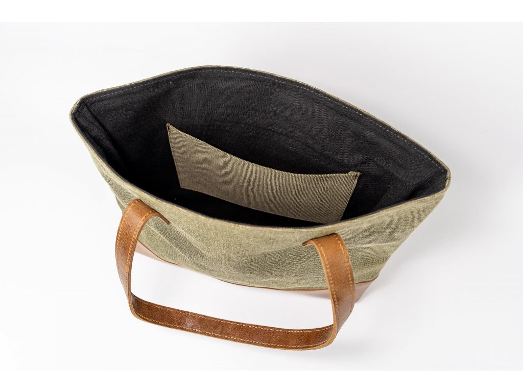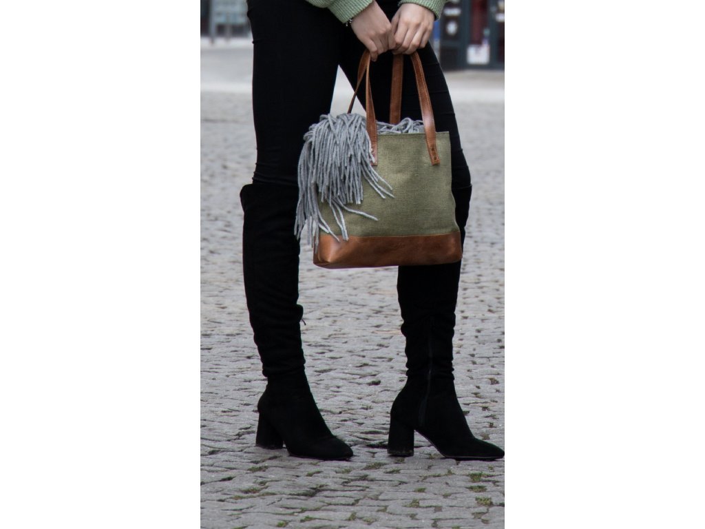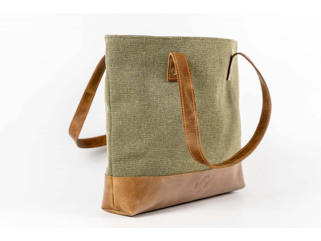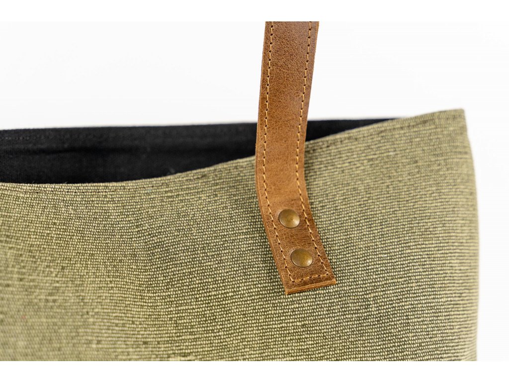 ŠALINI mestská taška je unikátnou kombináciou hovädzej rustikálnej kože a zeleného plátna, ktoré spája prírodnú autenticitu s modernou eleganciou. Jej otvorený dizajn bez zipsu či cvokov zaisťuje ľahký prístup k vašim veciam, zatiaľ čo jej veľkorysý vnútorný priestor poskytuje dostatok miesta pre všetko, čo potrebujete mať po ruke.