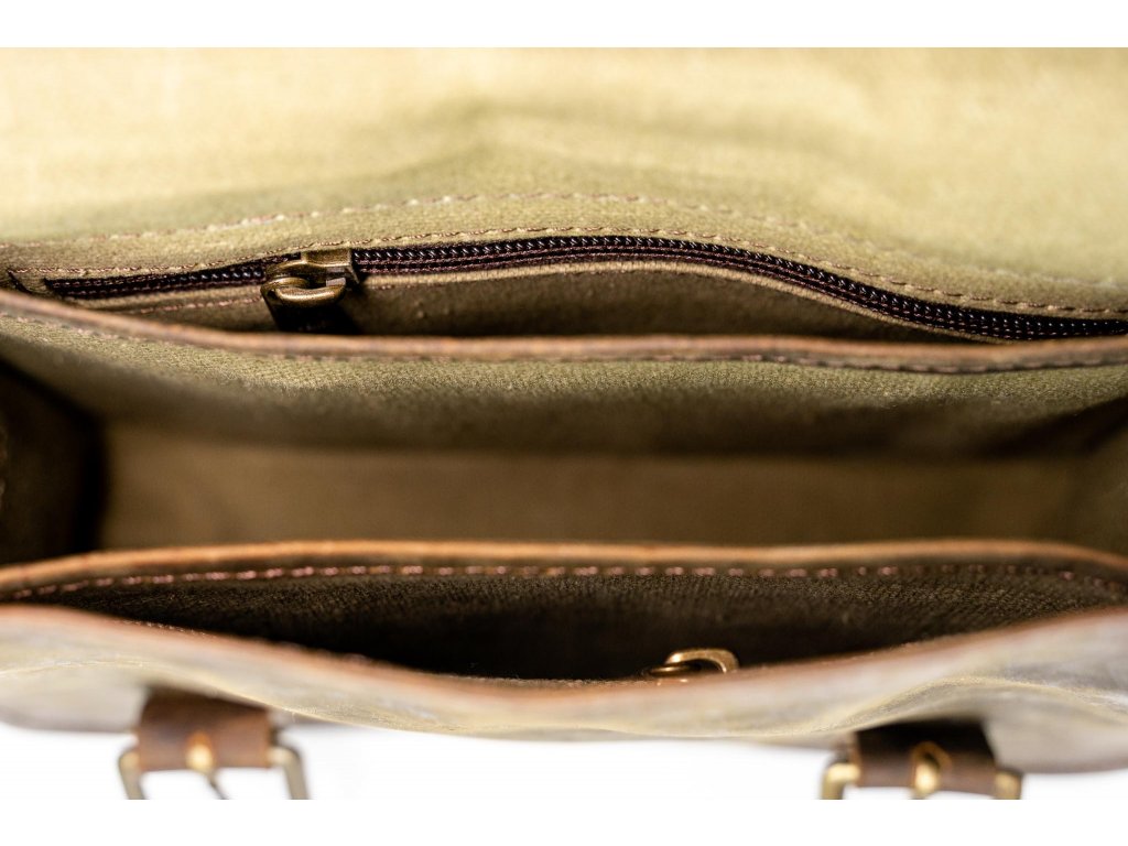 Vnútorný priestor je podšitý elegantnou zelenou látkou, ktorá dodáva taške osobitý charakter a zároveň zaisťuje ochranu jej obsahu. Poskytuje dostatok miesta pre všetky nevyhnutnosti a pomáha udržať veci prehľadne usporiadané.